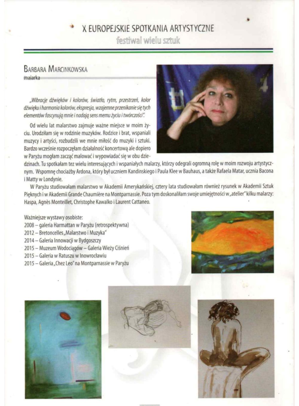 Dowodem tych poszukiwań są moja studia na Sorbonie na wydziale Estetyki Sztuk Plastycznych i Muzycznych, mój festiwal Europejskie Spotkania Artystyczne – festiwal wielu sztuk, moje wystawy „Muzyka i malarstwo”.